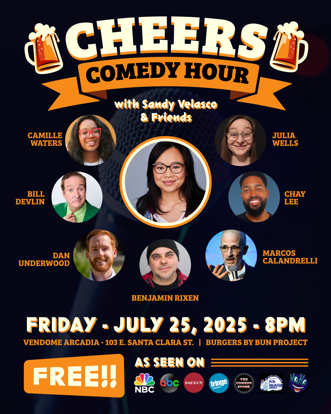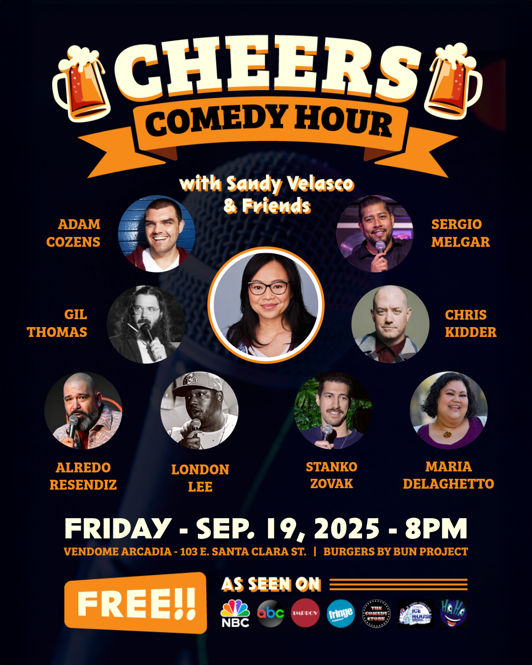 Enjoy a night of standup comedy with Sandy Velasco and Friends! Wine & spirits at Vendome and smashed burgers by Bun Project will also be available for purchase.